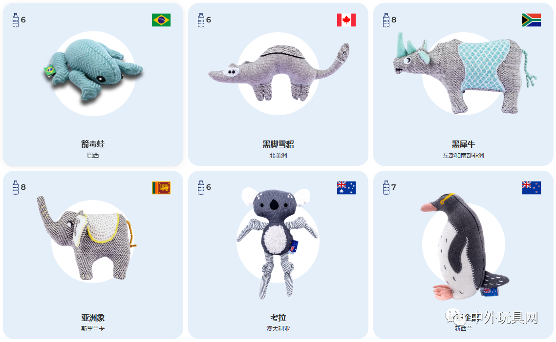 Avanti旗下環(huán)保玩具品牌RESPLOOT的毛絨產(chǎn)品,以全球各地珍稀動(dòng)物為主題,且標(biāo)注在制造過(guò)程中使用了多少回收的塑料瓶